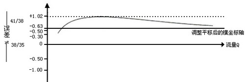 設計的調整齒輪是38/35,檢驗誤差時若示值大與真值,即出現“+”誤差。例如+1.02~+0.3,見誤差調整圖,查調整齒輪表(見下圖),得知選用41/38調整齒輪比較合適,這樣誤差曲線的原點便由38/35 調整齒輪對應的零位上移至41/38調整齒輪對應的+0.63的位置。因而誤差曲線便處于新的坐標系中,即誤差調整至+0.39~-0.33的范圍內,而流量計的準確度達到要求。
